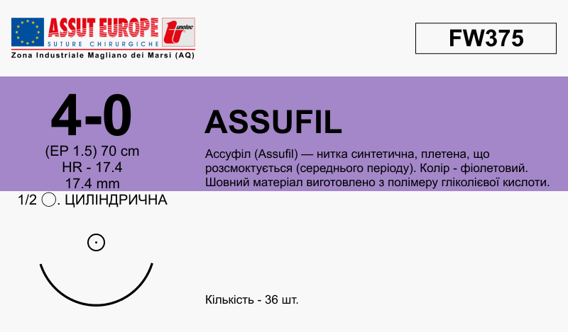 Рассасывающийся шовный материал Ассуфил (полимер гликолевой кислоты) с покрытием, USP 4/0, длина 70см, колющая игла 20мм, 1/2 окр., фиолетовая плетеная нить.