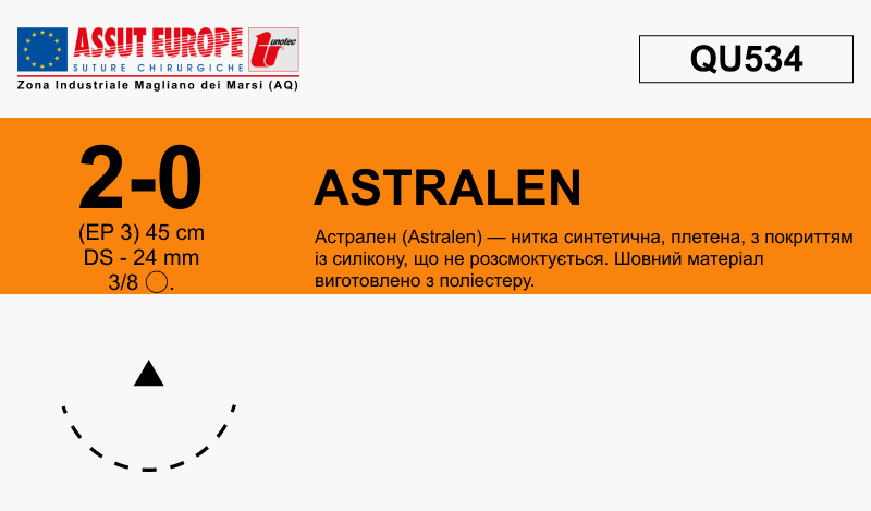Астрален (Astralen) — нить синтетическая, плетеная, с покрытием из нерассасывающегося силикона. Шовный материал изготовлен из полиэстера. Рекомендации — для общей хирургии; для соединения или лигирования тканей хирургической нитью, которая не рассасывается; в сердечно-сосудистой хирургии и ортопедии. Производитель: ASSUT Europe.