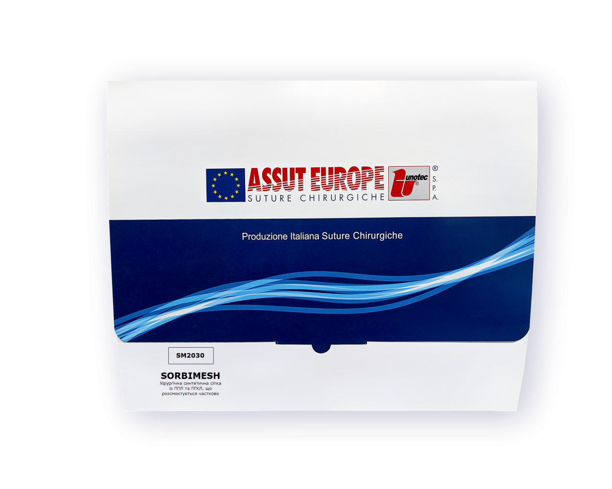Хирургическая сетка Sorbimesh (Сорбимеш) с ППЛ (полипропилен) и ПГКЛ (полигликолидкапролактон), частично рассасывающаяся, размер 20см х 30см. Данная сетка является прямым аналогом сетки Ultrapro от Johnson & Johnson Ethicon. Производитель: Assut Europe (Италия).