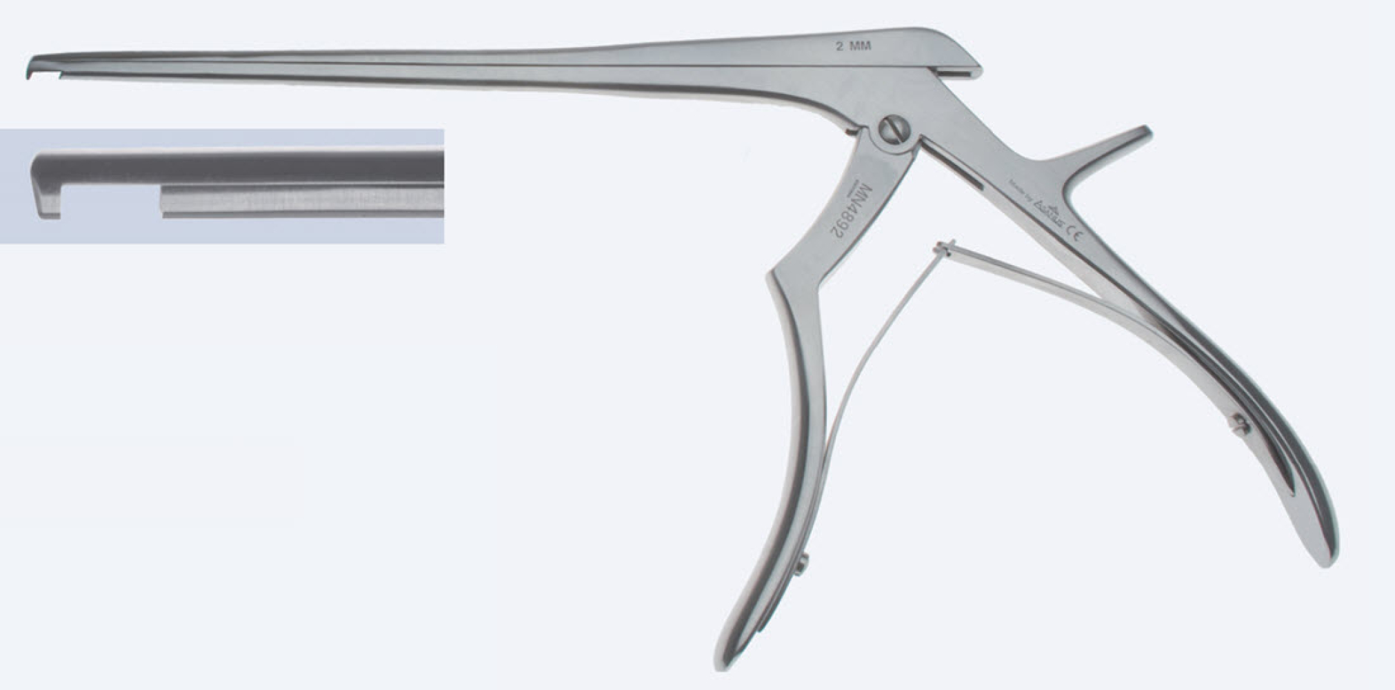 Костные кусачки (панч, пуансон, выкусыватель) – медицинский хирургический инструмент, широко используемый во многих направлениях медицины и хирургии. Основная характерная черта данного инструмент – наличие острой и прочной режущей кромки, рабочей части, которая обеспечивает плавное и аккуратное откусывание костного материала или других по существу твердых веществах, таких как хрящевая ткань. Кусачки костные являются многоразовым инструментом, поэтому для обеспечения длительного срока эксплуатации при изготовлении используется нержавеющая сталь, титан. Учитывая плотность кости, кусачки также должны иметь максимально надежную и устойчивую конструкцию, позволяющую прикладывать максимум усилий при перекусывании. Медицинский инструмент, входящий в стандартный хирургический набор, имеет плавный ход за счет особой конструкции, благодаря чему обеспечивается надежный захват кости. Костные выкусыватели используются для рассечения кости, выравнивания краев после распила кости. Данный костный выкусыватель используется при проведении операций на позвоночнике в спинальной хирургии.