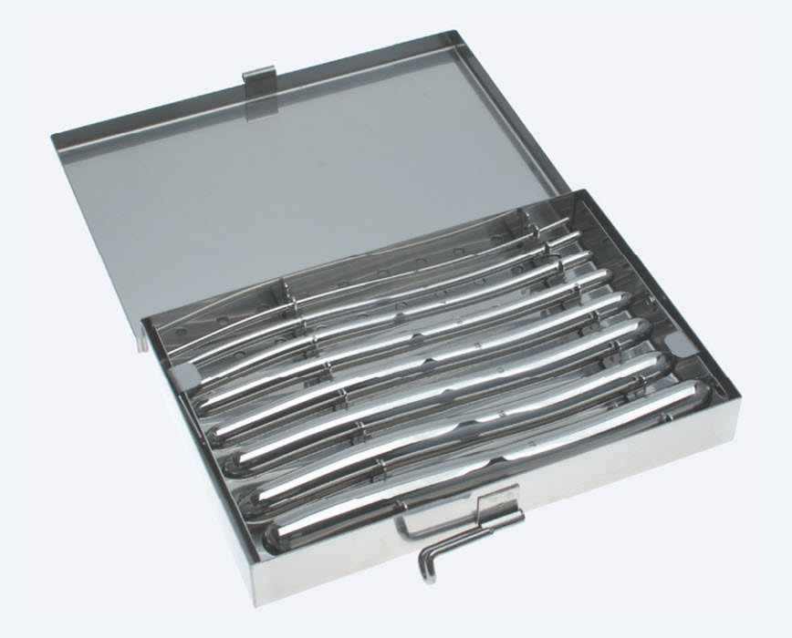 Дилататор – это медицинский инструмент, который также называют расширителем. Он используется для расширения естественных каналов и/или отверстий в случаях сужения их из-за патологических процессов в организме человека. Классификация дилататоров довольно большая и зависит от строения инструмента, назначения, автора, других особенностей. Большая часть расширителей используется в узком направлении хирургии. Дилататор активно используется в области гинекологии для проведения различных операций и процедур. Металлический контейнер для 8 маточных расширителей (дилататоров) предназначен для удобного и простого хранения, а также перемещения хирургических маточных дилататор.