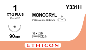 Рассасывающийся шовный материал Монокрил (Monocryl) 1, длина 90см, кол. игла 26мм, 1/2 окр., фиолетовая нить. Синтетический рассасывающийся моноволоконный шовный материал, состоит из гликолида и эпсилон-капролактона. Производитель: ETHICON part of the JOHNSON&JOHNSON family of companies.