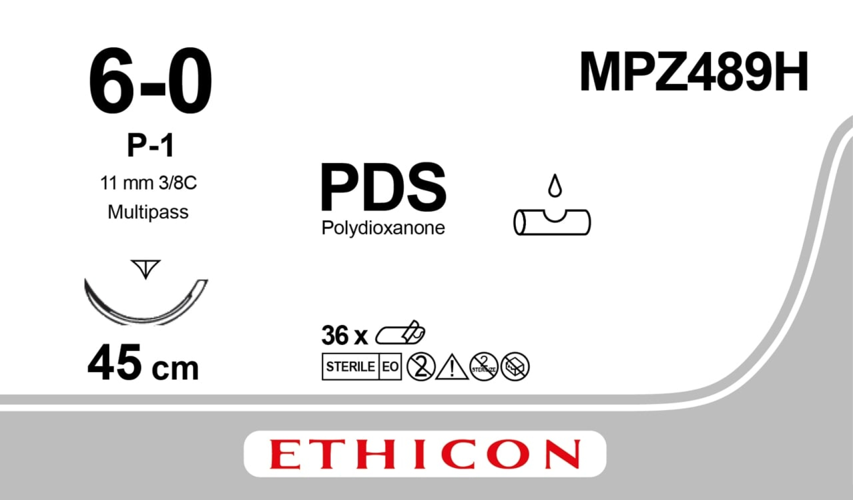 Рассасывающийся шовный материал ПДС II (PDS II) 6/0, длина 45см, обр-реж. игла 11мм, 3/8 окр., неокрашенная нить. Монофиламентная рассасывающая синтетическая нить с максимальным сроком сохранения прочности. Производитель: ETHICON part of the JOHNSON&JOHNSON family of companies.