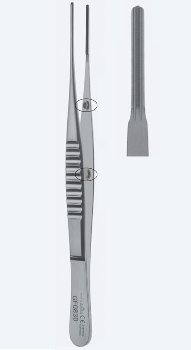 Пинцет атравматический DeBakey, длина 300мм, прямой, кончик 2,8мм, с ограничителем для безопасного сведения браншей GF0878