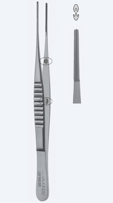 Пинцет атравматический DeBakey, длина 350мм, прямой, кончик 2,0мм, с ограничителем для безопасного сведения браншей GF0889