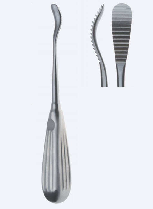 Распатор хирургический костный Aufricht, длина 220мм, изогнутый, ширина 9,0мм, зубчики направлены вверх NS2790