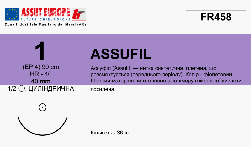 Шовний матеріал, що розсмоктується Ассуфіл (полімер гліколевої кислоти) з покриттям, USP 1, довжина 90см, посилена колюча голка 40мм, 1/2 кола, фіолетова плетена нитка.