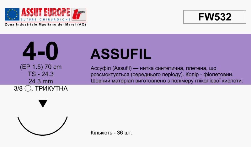 Шовний матеріал, що розсмоктується Ассуфіл (полімер гліколевої кислоти) з покриттям, USP 4/0, довжина 70см, ріжуча голка 24мм, 3/8 кола, фіолетова плетена нитка.