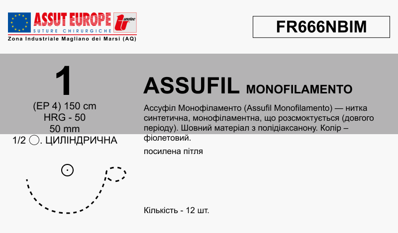 Ассуфіл Монофіламенто (Assufil Monofilamento) 1, довжина 150см, посилена кол. голка 50мм FR666NBIM