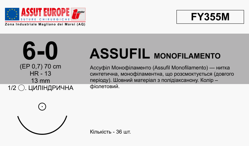 Шовний матеріал, що розсмоктується Ассуфіл Монофіламенто (полідіоксанон), USP 6/0, довжина 70см, колюча голка 13мм, 1/2 кола, фіолетова мононитка.