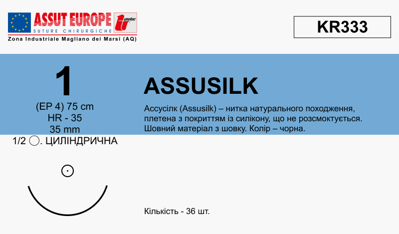 Шовний матеріал, що не розсмоктується Ассусілк (шовк), USP 1, довжина 75см, колюча голка 35мм, 1/2 кола, чорна плетений з покриттям.