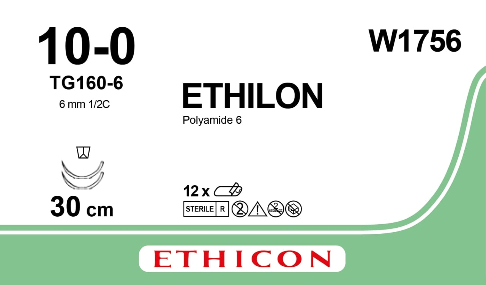Шовний матеріал, що не розсмоктується Етілон (Ethilon) 10/0, довжина 30см, 2 шпательні голки 6мм, 1/2 кола, чорна нитка. Монофіламентний синтетичний шовний матеріал, що не розсмоктується виготовлений з поліаміду 6 або 66 методом екструзії. Виробник: ETHICON part of the JOHNSON & JOHNSON family of companies.