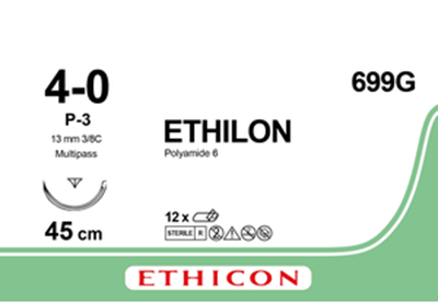 Етілон (Ethilon) 4/0, довжина 45см, зв-ріж. голка 13мм 699G