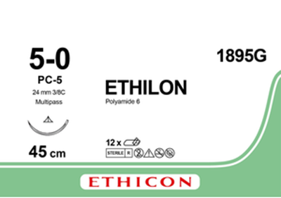 Шовний матеріал, що не розсмоктується Етілон (Ethilon) 5/0, довжина 45см, ріж. голка 24мм, 3/8 кола, чорна нитка. Монофіламентний синтетичний шовний матеріал, що не розсмоктується виготовлений з поліаміду 6 або 66 методом екструзії. Виробник: ETHICON part of the JOHNSON & JOHNSON family of companies.