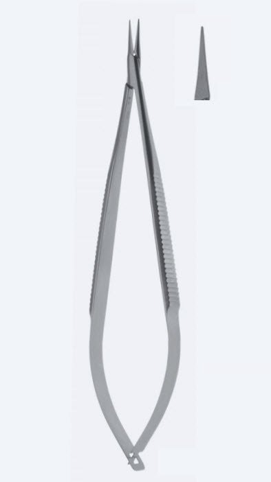 Голкотримач мікро, довжина 140мм, вигнутий, кінчик 0,4мм, для ниток 8/0-12/0, без замка. Виробник Asanus (Germany).