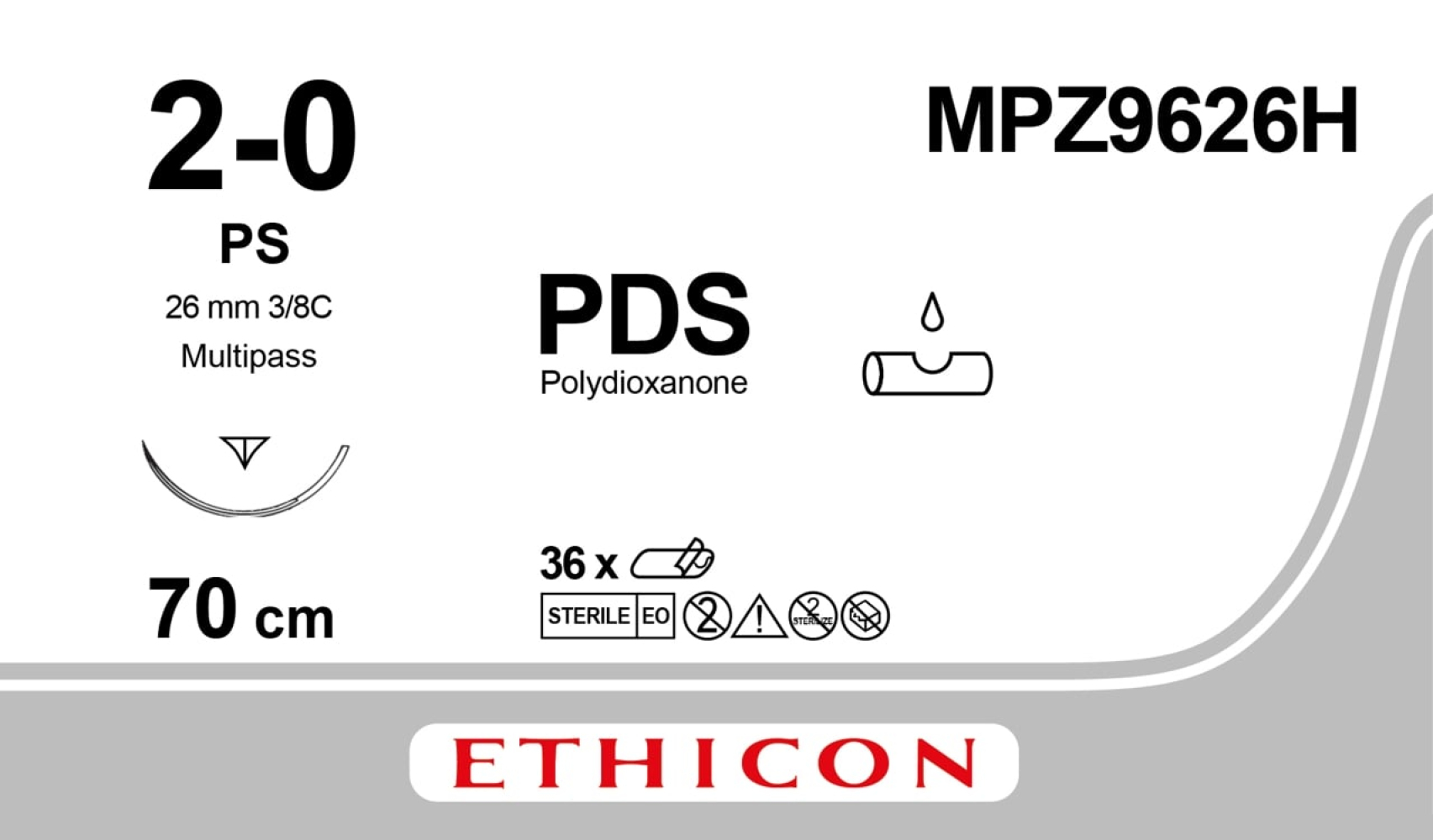 Шовний матеріал, що розсмоктується ПДС II (PDS II) 2/0, довжина 70см, зв-ріж. голка 26мм, 3/8 кола, незабарвлена нитка. Монофіламентна синтетична нитка, що розсмоктується з максимальним терміном збереження міцності. Виробник: ETHICON part of the JOHNSON&JOHNSON family of companies.