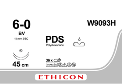 Шовний матеріал, що розсмоктується ПДС II (PDS II) 6/0, довжина 45см, 2 кол. голки 11мм, 3/8 кола, фіолетова нитка. Монофіламентна синтетична нитка, що розсмоктується з максимальним терміном збереження міцності. Виробник: ETHICON part of the JOHNSON&JOHNSON family of companies.