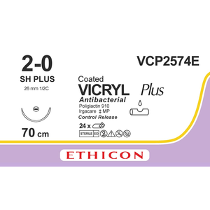 Вікрил Плюс (Vicryl Plus) 2/0, 4шт. по 70см, кол. голка 26мм, з'єднання Control Release, 1/2 кола, фіолетова нитка. Є антибактеріальним (поліглактин 910), синтетичним стерильним хірургічним шовним матеріалом, що розсмоктується, виготовленим із сополімера, який на 90% складається з гліколіда та на 10% з L-лактида. Виробник: ETHICON part of the JOHNSON&JOHNSON family of companies.