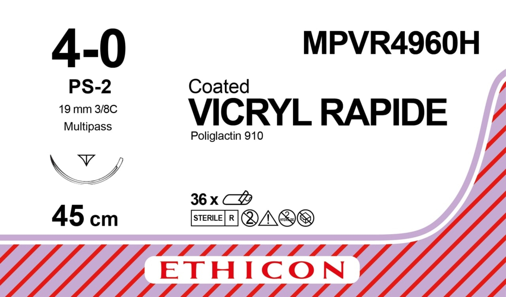 Шовний матеріал, що розсмоктується Вікрил Рапід (Vicryl Rapide) 4/0, довжина 45см, зв-ріж. голка 19мм, 3/8 кола, незабарвлена нитка. Синтетичний поліфіламентний шовний матеріал, що розсмоктується, складається з поліглактіна 910, синтетичного сополімеру. Виробник: ETHICON part of the JOHNSON & JOHNSON family of companies.