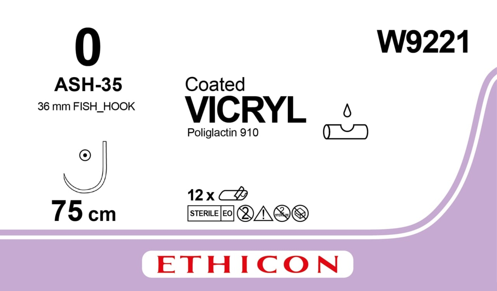 Викрил (Vicryl) 0, длина 75см, кол. игла 36мм, крючок, фиолетовая нить. Cинтетический рассасывающийся полифиламентный шовный материал Викрил (Vicryl) Полиглактин 910. Производитель: ETHICON part of the JOHNSON&JOHNSON family of companies.