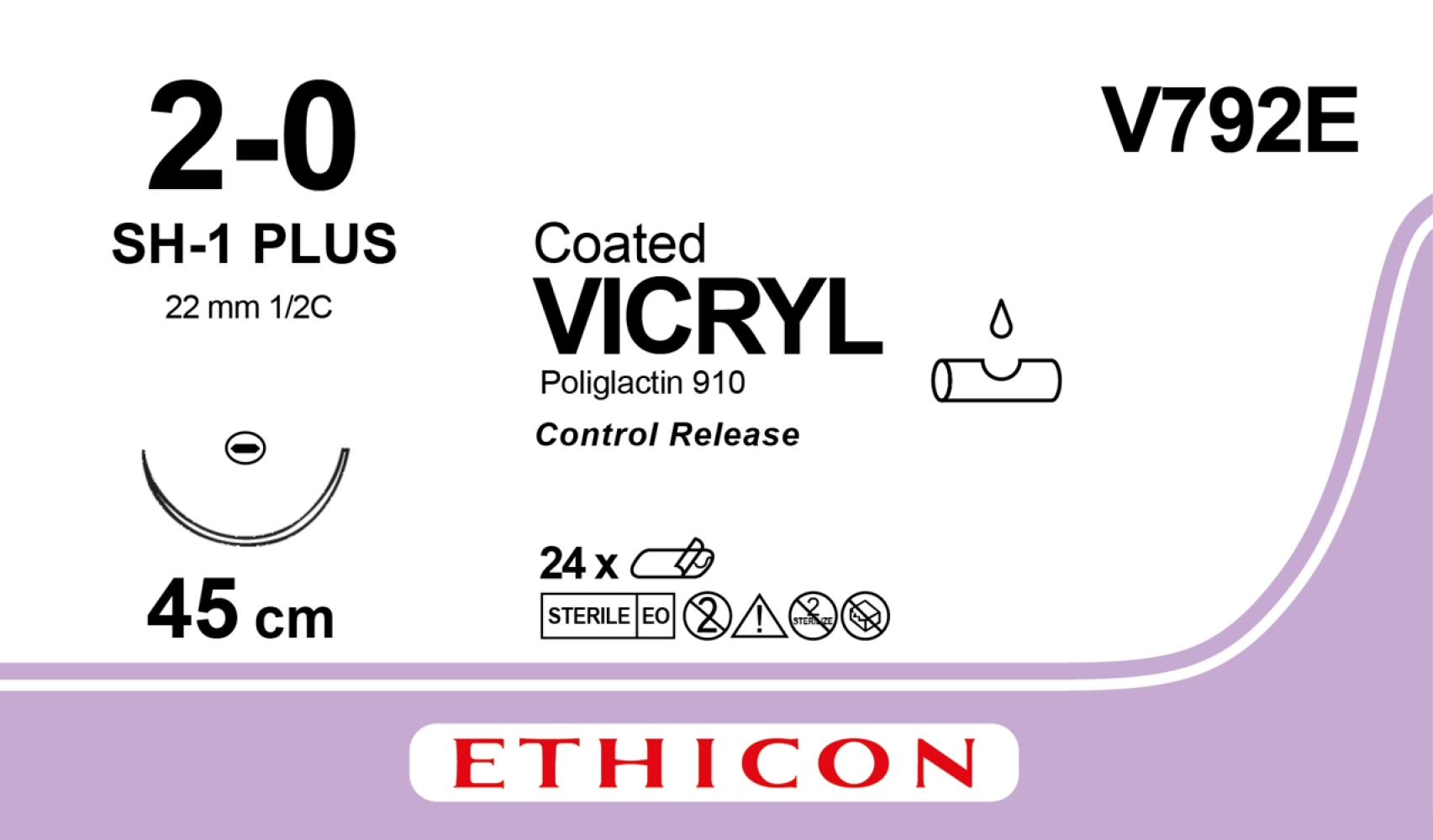 Викрил (Vicryl) 2/0, 8 шт. по 45см, кол. игла 22мм, соединение Control Release, 1/2 окр., фиолетовая нить. Cинтетический рассасывающийся полифиламентный шовный материал Викрил (Vicryl) Полиглактин 910. Производитель: ETHICON part of the JOHNSON&JOHNSON family of companies.