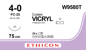 Викрил (Vicryl) 4/0, длина 75см, обр-реж. игла 26мм, 3/8 окр., неокрашенная нить. Cинтетический рассасывающийся полифиламентный шовный материал Викрил (Vicryl) Полиглактин 910. Производитель: ETHICON part of the JOHNSON&JOHNSON family of companies.