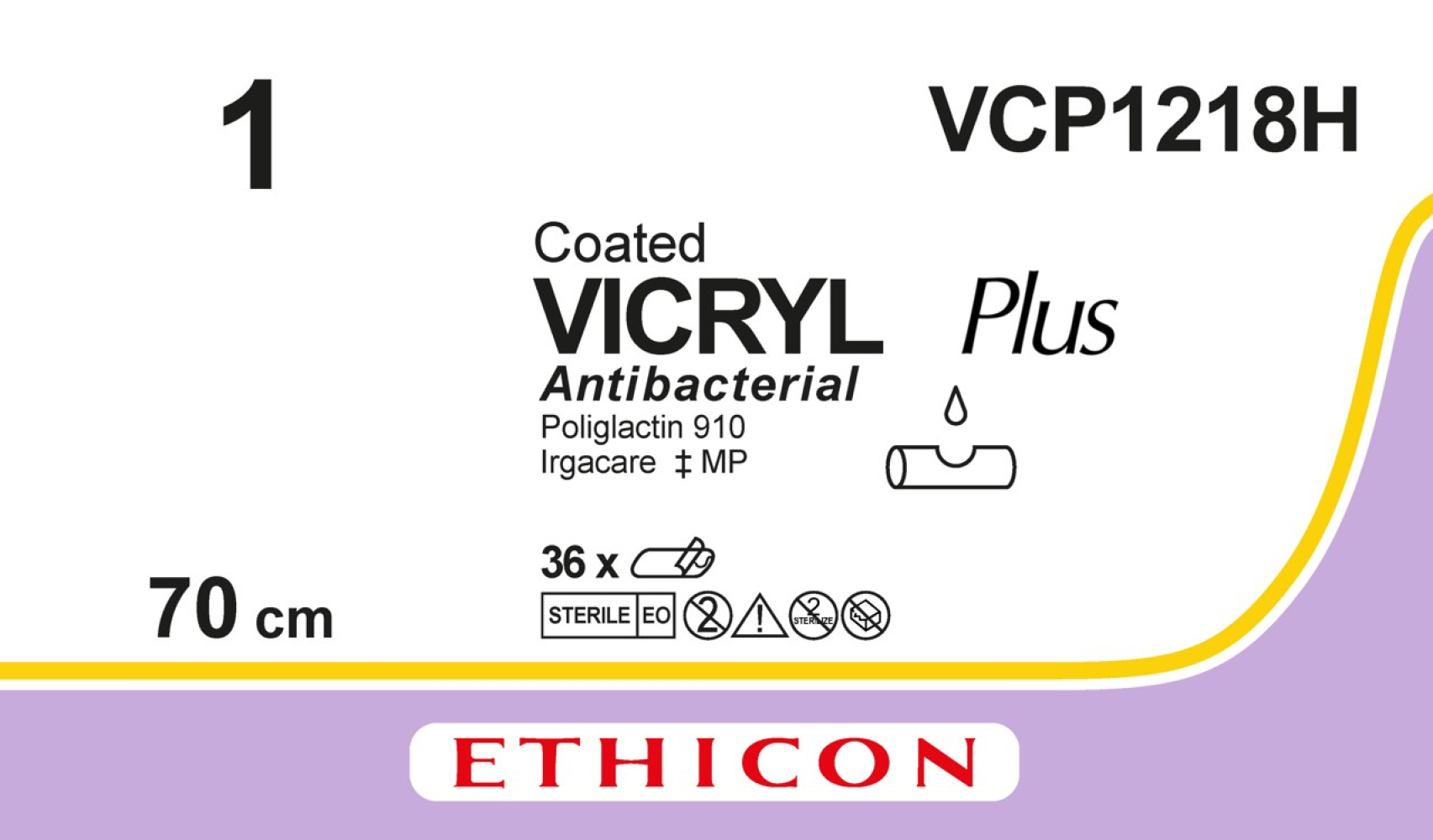 Викрил Плюс (Vicryl Plus) 1, 5 шт. по 70см, без иглы, фиолетовая нить. Является антибактериальным (полиглактин 910), синтетическим, рассасывающимся стерильным хирургическим шовным материалом, изготовленным из сополимера, который на 90% состоит из гликолида и на 10% из L-лактида. Производитель: ETHICON part of the JOHNSON&JOHNSON family of companies.