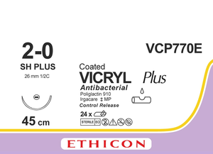 Викрил Плюс (Vicryl Plus) 2/0, 8 шт. по 45см, кол. игла 26мм, соединение Control Release, 1/2 окр., неокрашенная нить. Является антибактериальным (полиглактин 910), синтетическим, рассасывающимся стерильным хирургическим шовным материалом, изготовленным из сополимера, который на 90% состоит из гликолида и на 10% из L-лактида. Производитель: ETHICON part of the JOHNSON&JOHNSON family of companies.