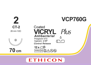 Викрил Плюс (Vicryl Plus) 2, 4шт. по 70см, кол. игла 26мм, соединение Control Release, 1/2 окр., фиолетовая нить. Является антибактериальным (полиглактин 910), синтетическим, рассасывающимся стерильным хирургическим шовным материалом, изготовленным из сополимера, который на 90% состоит из гликолида и на 10% из L-лактида. Производитель: ETHICON part of the JOHNSON&JOHNSON family of companies.