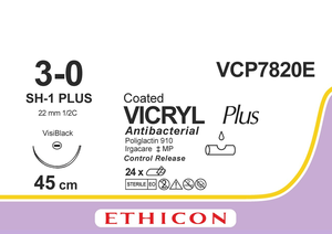 Викрил Плюс (Vicryl Plus) 3/0, 4шт. по 45см, кол. игла 22мм, Visi Black, соединение Control Release, 1/2 окр., фиолетовая нить. Является антибактериальным (полиглактин 910), синтетическим, рассасывающимся стерильным хирургическим шовным материалом, изготовленным из сополимера, который на 90% состоит из гликолида и на 10% из L-лактида. Производитель: ETHICON part of the JOHNSON&JOHNSON family of companies.
